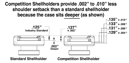 Le numéro estampillé sur le dessus porte-douilles de compétition Redding indique sa profondeur par rapport à cette norme, et donc la réduction de l’espace entre la douille et la chambre.